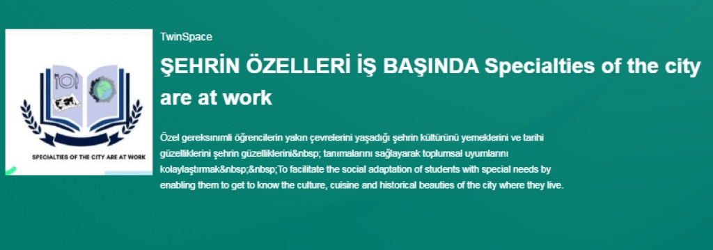 Özel gereksınımli öğrencilerin yakın çevrelerini, yaşadığı şehrin kültürünü, yemeklerini ve tarihi güzelliklerini tanımalarını sağlayarak toplumsal uyumlarını kolaylaştırmayı amaçlayan Şehrin Özelleri İş Başında eTwinning Projesi Türkiyenin çeşitli illerinden ve Romanyadan ortaklarımızla devam etmektedir.